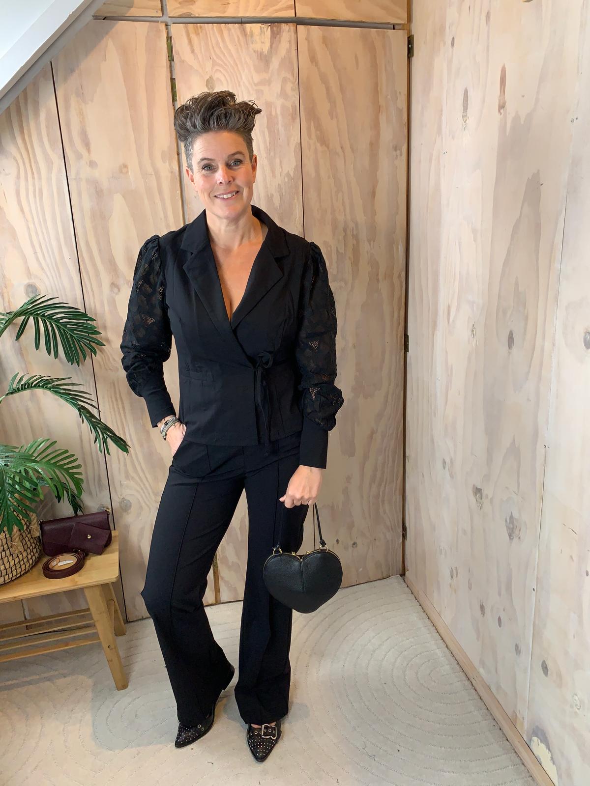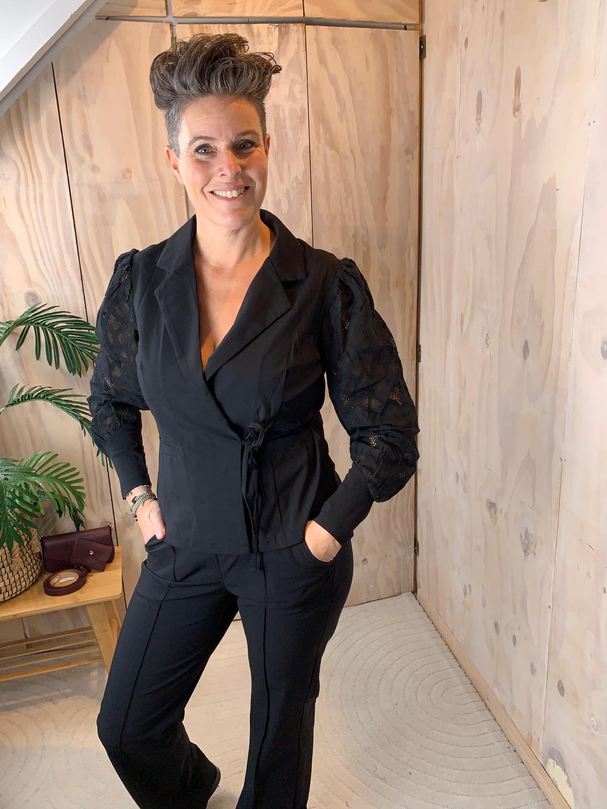 Mooie getailleerde blazer in travelstof met licht poffende mouwen van zacht kant met een lang manchet en een striksluiting in dezelfde kleur als de blazer. De blazer heeft coupenaden aan de voorkant en heeft paspelzakken. Draag de blazer met een van de Triple Nine travelbroeken voor de complete look! De blazer valt goed op maat S = 36..