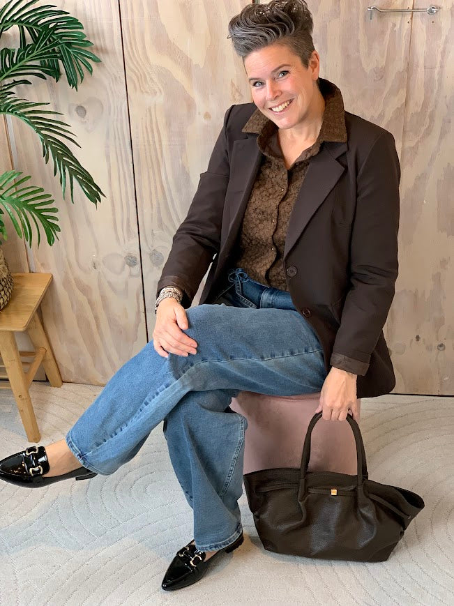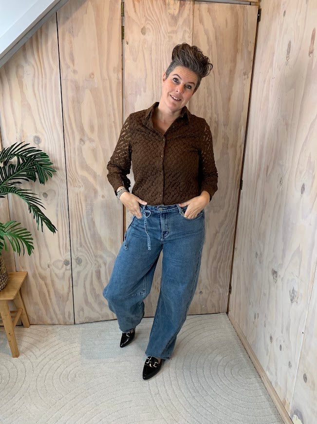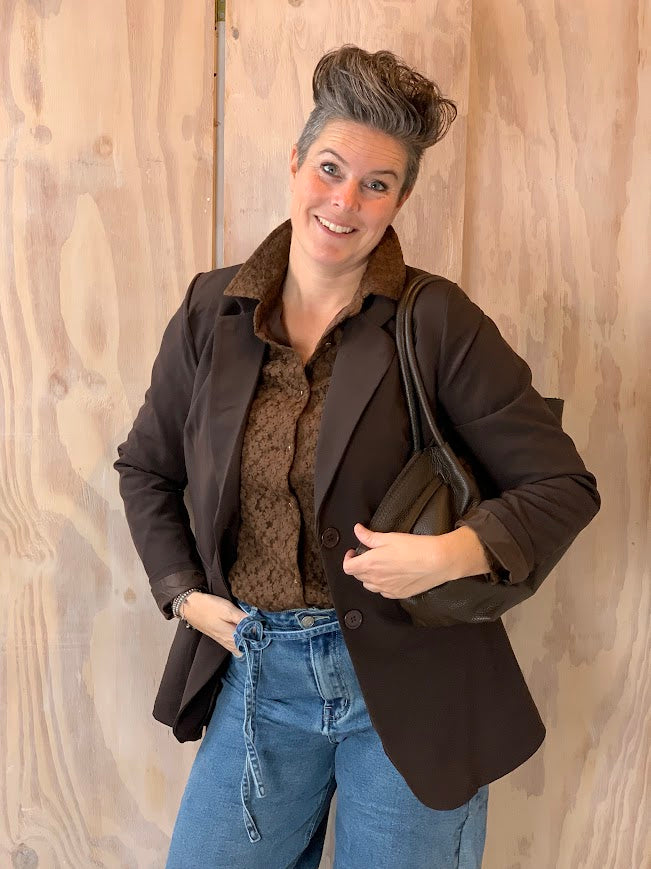 De donkerbruine blouse is een echte blikvanger dankzij het bloemmotief. De parelknopjes en het doorzichtige effect bij de mouwen geven de blouse een elegante en vrouwelijke uitstraling.