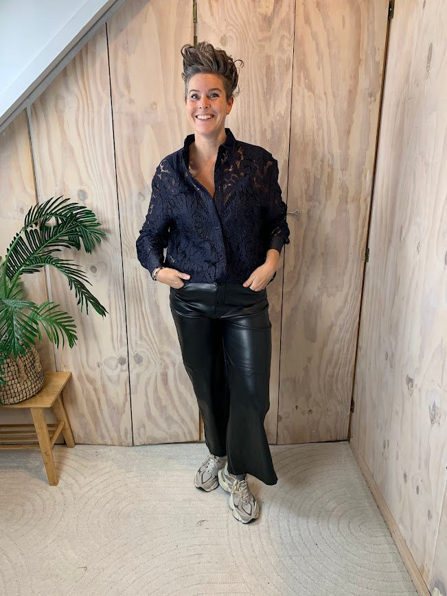 De blouse Flo is een echte eyecatcher dankzij de elegante blauwe kant en de stijlvolle denimdetails bij de kraag en manchetten. Het kant heeft een patroon dat subtiel doorschijnt, waardoor de blouse een vrouwelijke en moderne uitstraling krijgt.