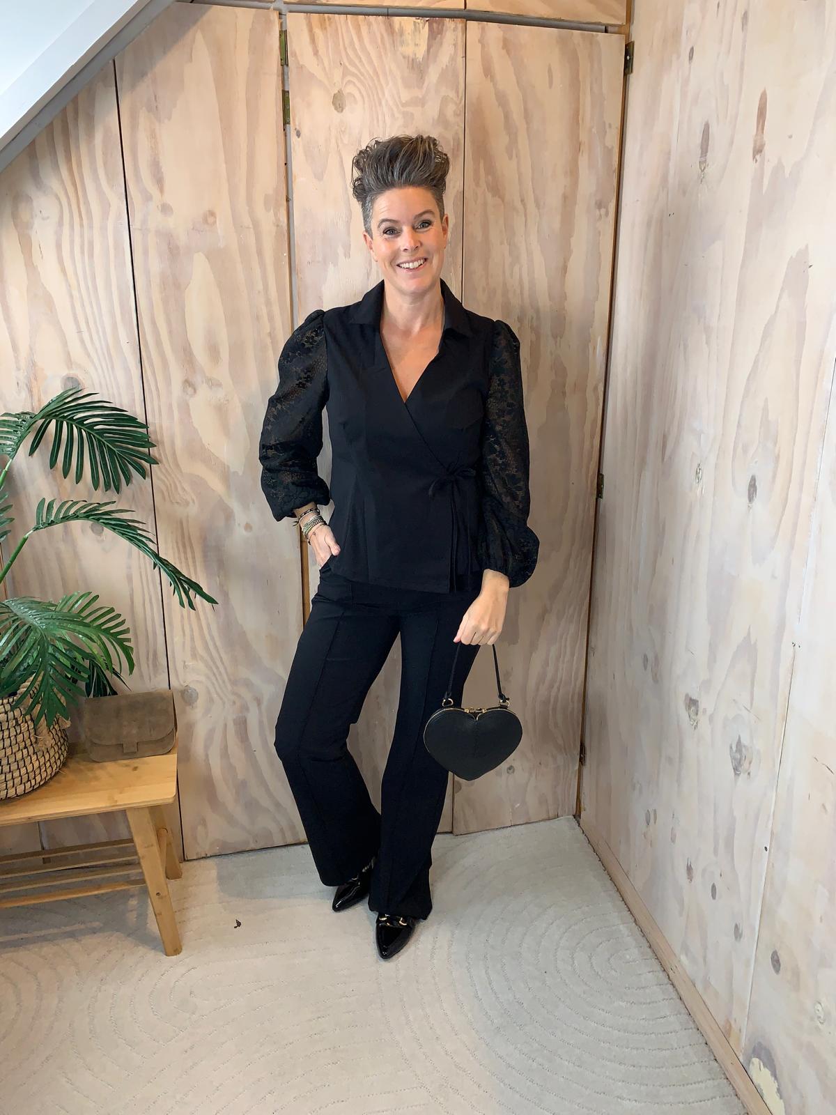 Een prachtig detail is de overslag, die je aan de zijkant vastzet met een verfijnd strikje – dit geeft het bloesje net dat beetje extra charme. Perfect om zowel netjes als casual te dragen.