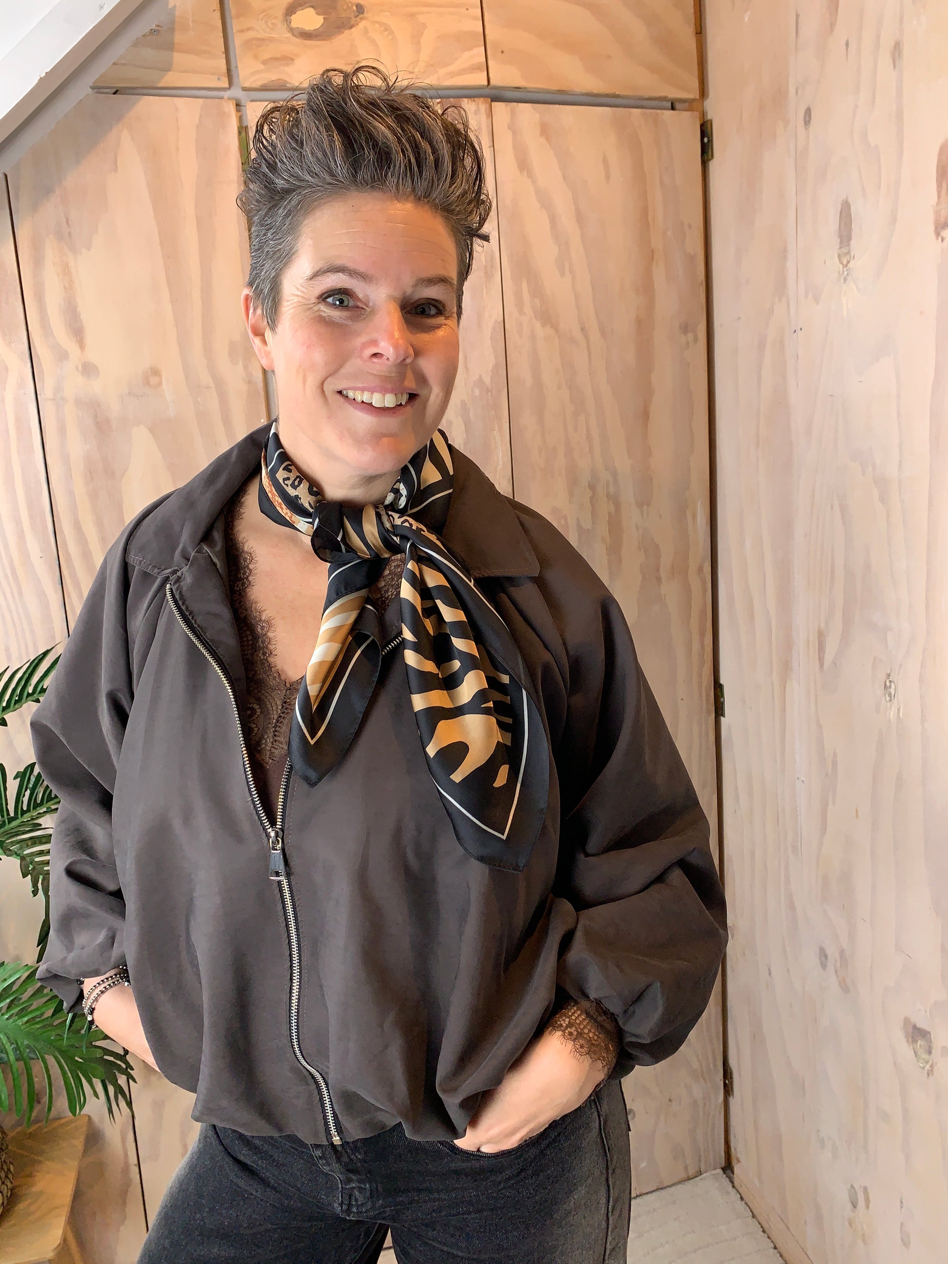 Dit prachtige bruin-taupe bomberjasje is zo’n item dat je élke dag uit de kast pakt. Het model heeft een lichte pofmouw door het elastiek bij de manchetten, wat het jasje een speelse, vrouwelijke look geeft. De stof is een fijne, normale kwaliteit die soepel valt en heerlijk draagt.