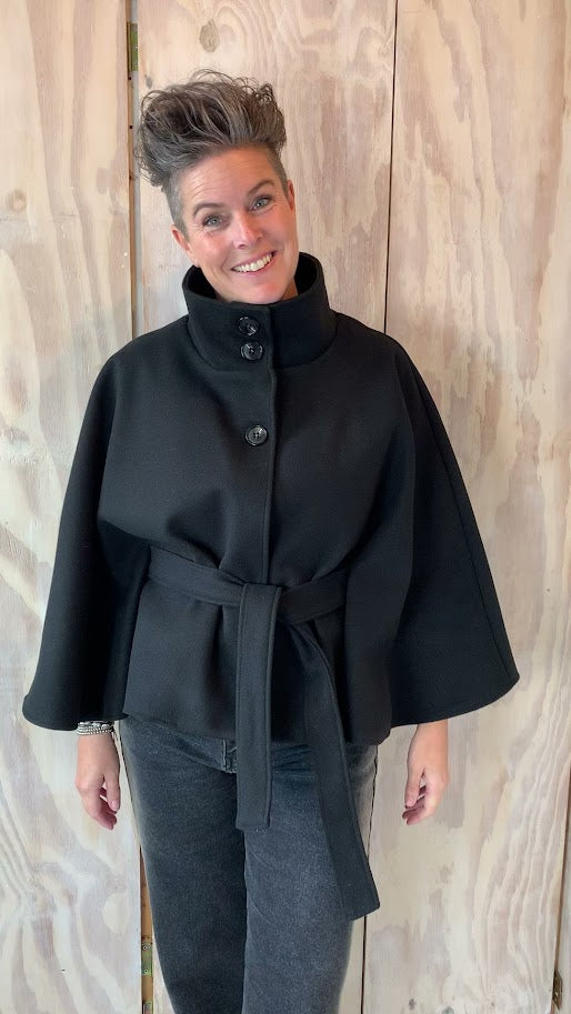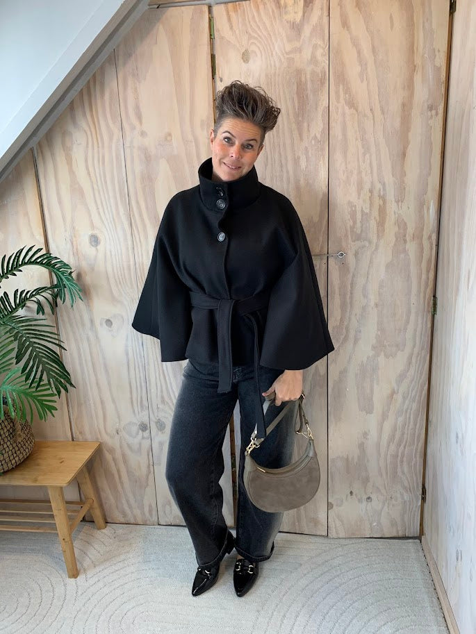 Ontdek het zwarte jasje met ceintuur dat iedere outfit naar een hoger niveau tilt. Het getailleerde design, subtiel geaccentueerd door het elegante ceintuur, omarmt je silhouet op een verfijnde manier, terwijl de vleermuismouwen zorgen voor een moderne, luxueuze touch.