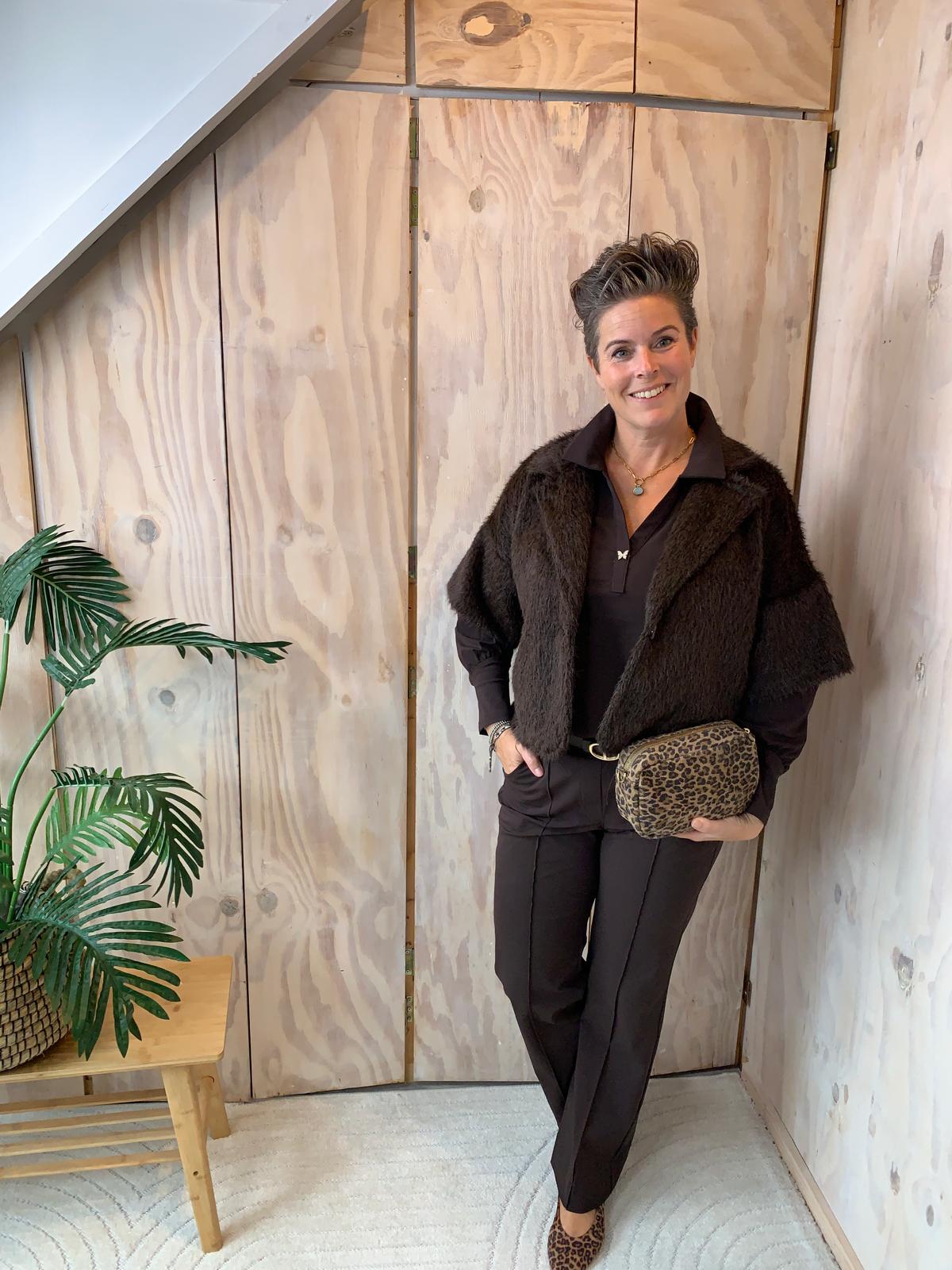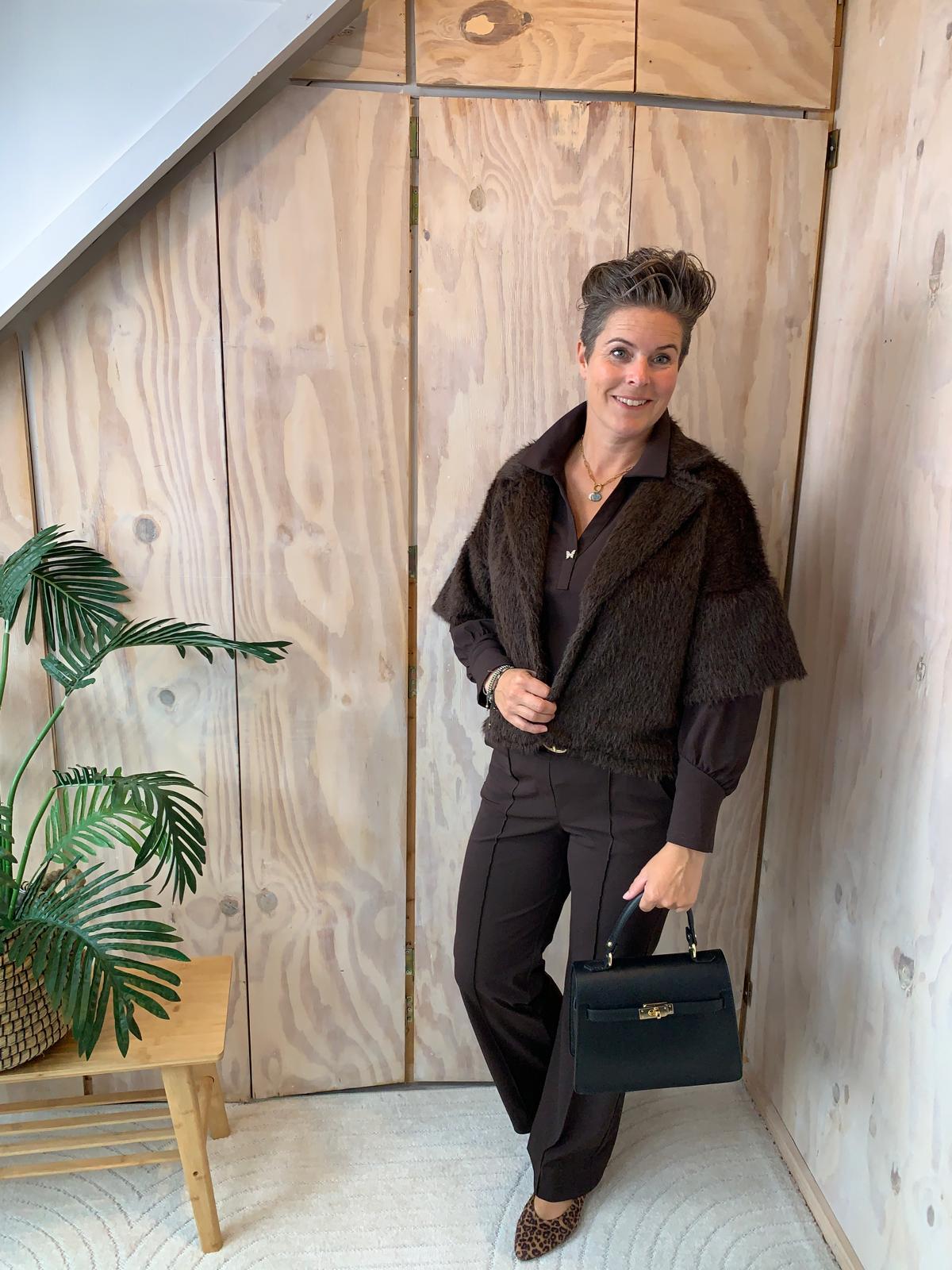 De donkerbruine kleur geeft een elegante, tijdloze uitstraling die perfect past bij zowel casual als chique outfits. Dankzij het korte mouwtje oogt het speels en luchtig, terwijl de zachte, pluizige structuur zorgt voor een heerlijk comfortabel gevoel.