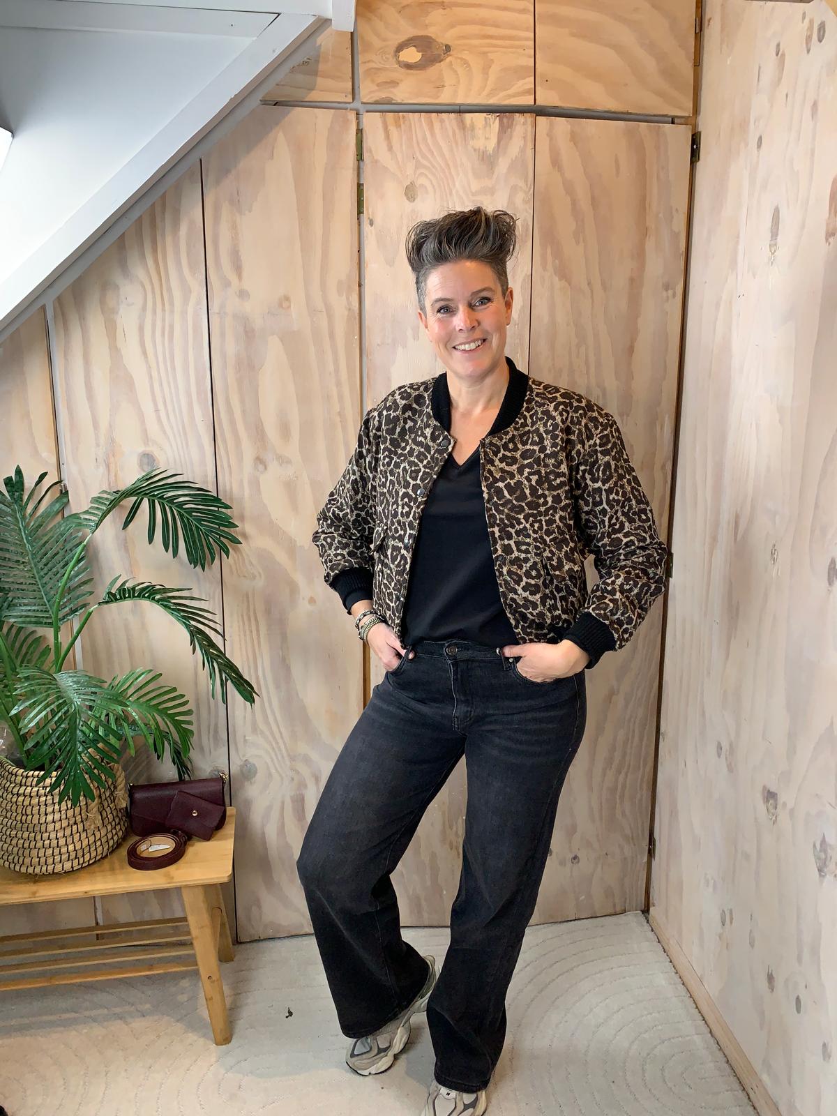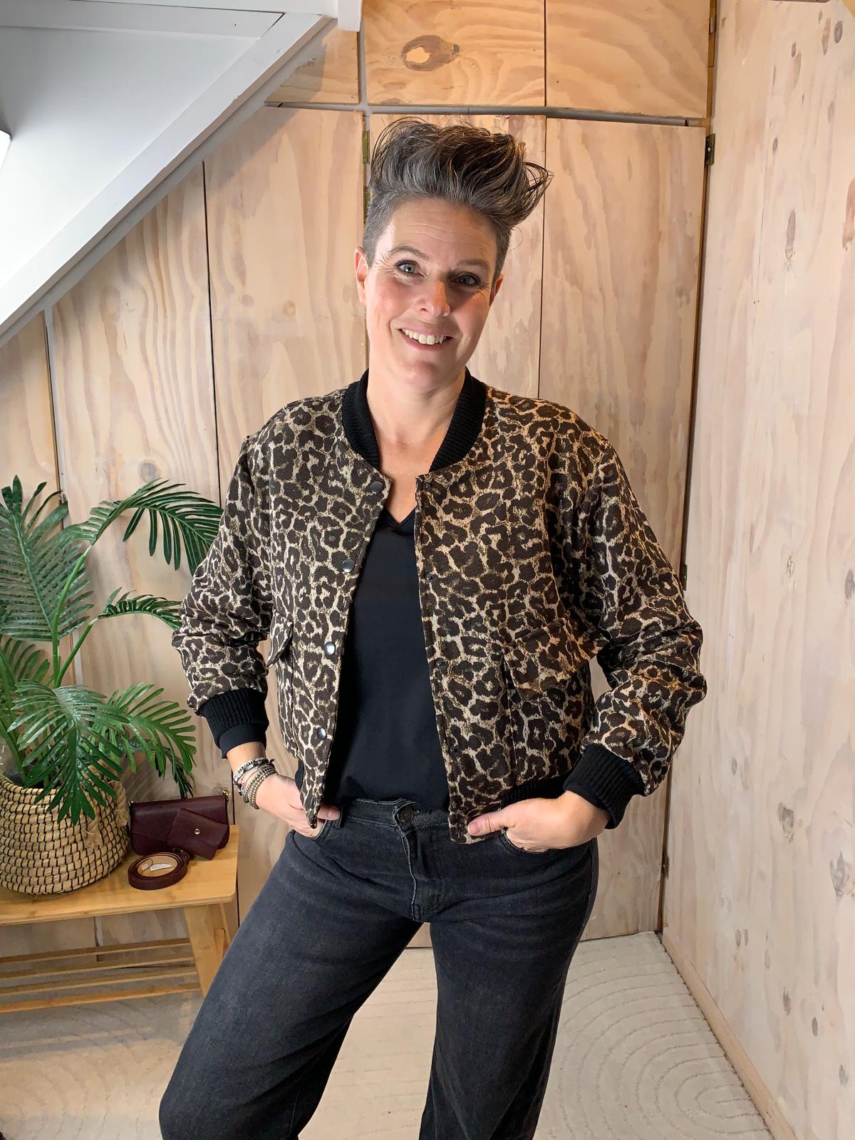 Dit jasje is een echte eyecatcher en geeft iedere outfit direct een stoere, vrouwelijke uitstraling. De panterprint in zwart met bruin zorgt voor een warme, krachtige look die makkelijk te combineren is. De zwarte afwerking aan de band geeft het jasje een mooi contrast en een luxe finish.
