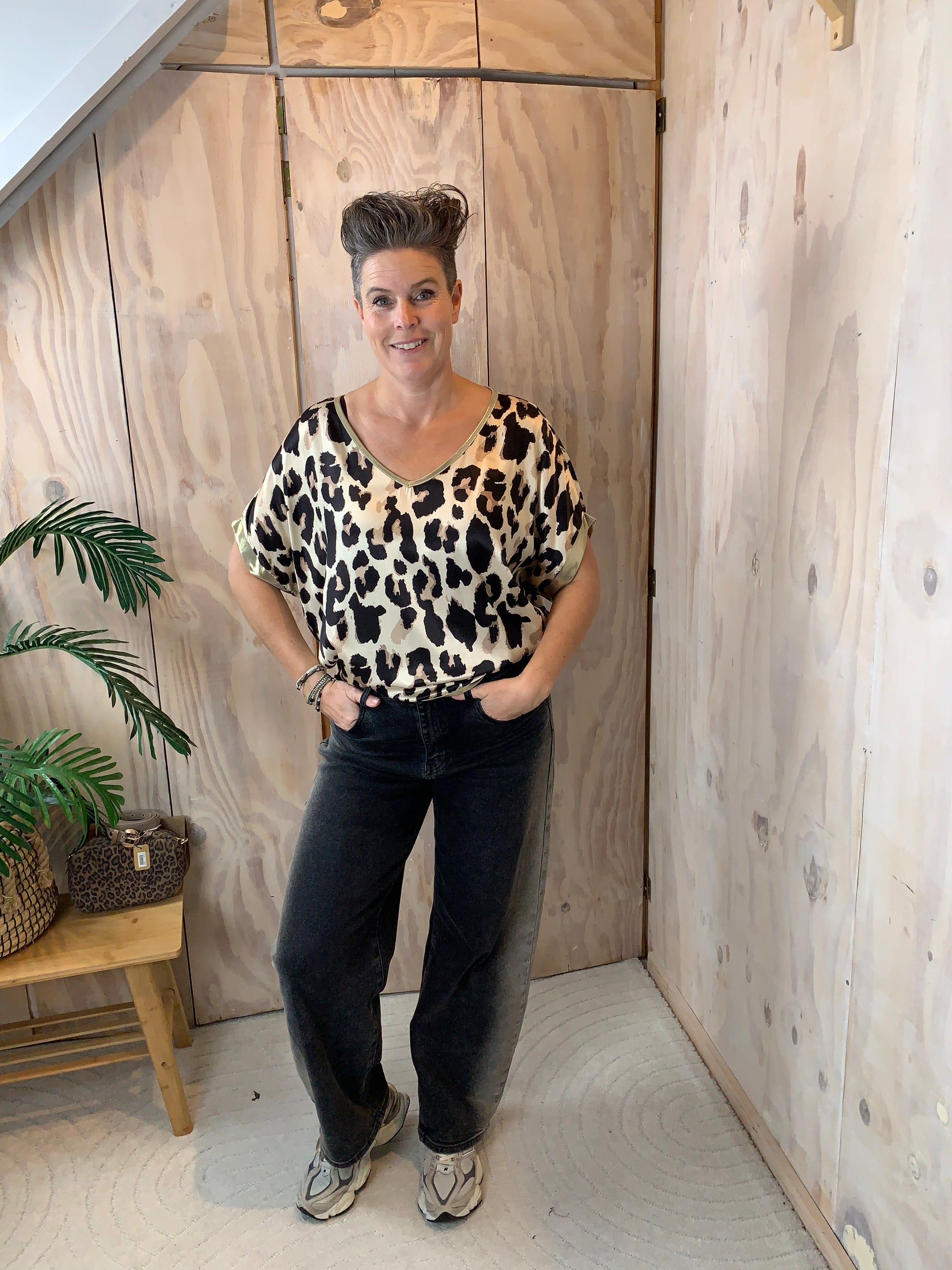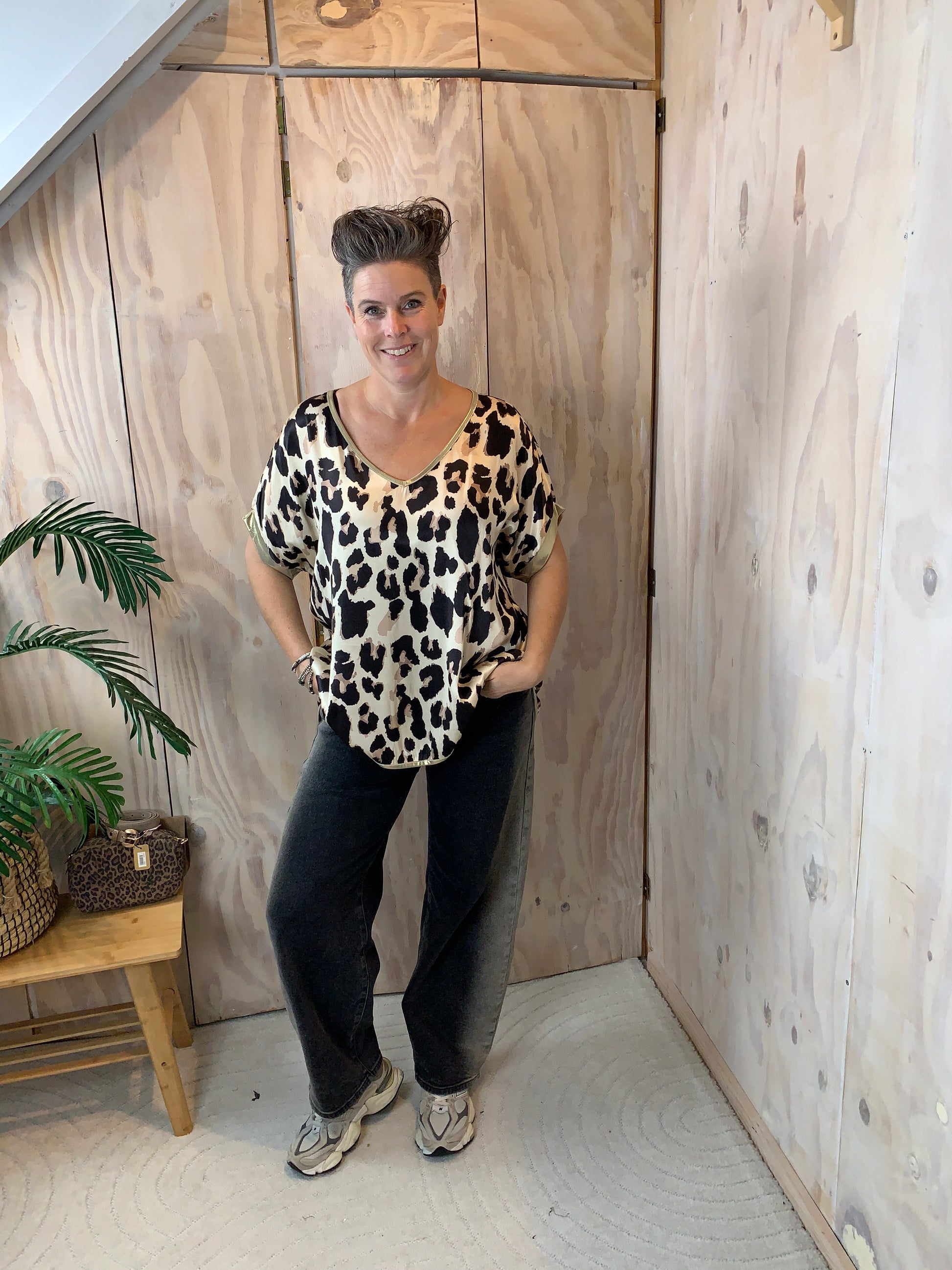 Mooi top om satijn look panterprint en afgezet met een goud randje deze top is 1 maat en te dragen t/m een ruime xxl