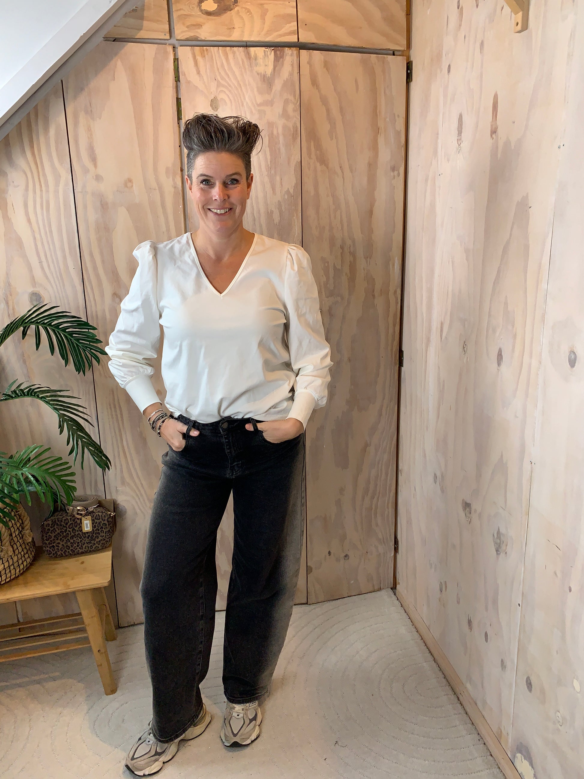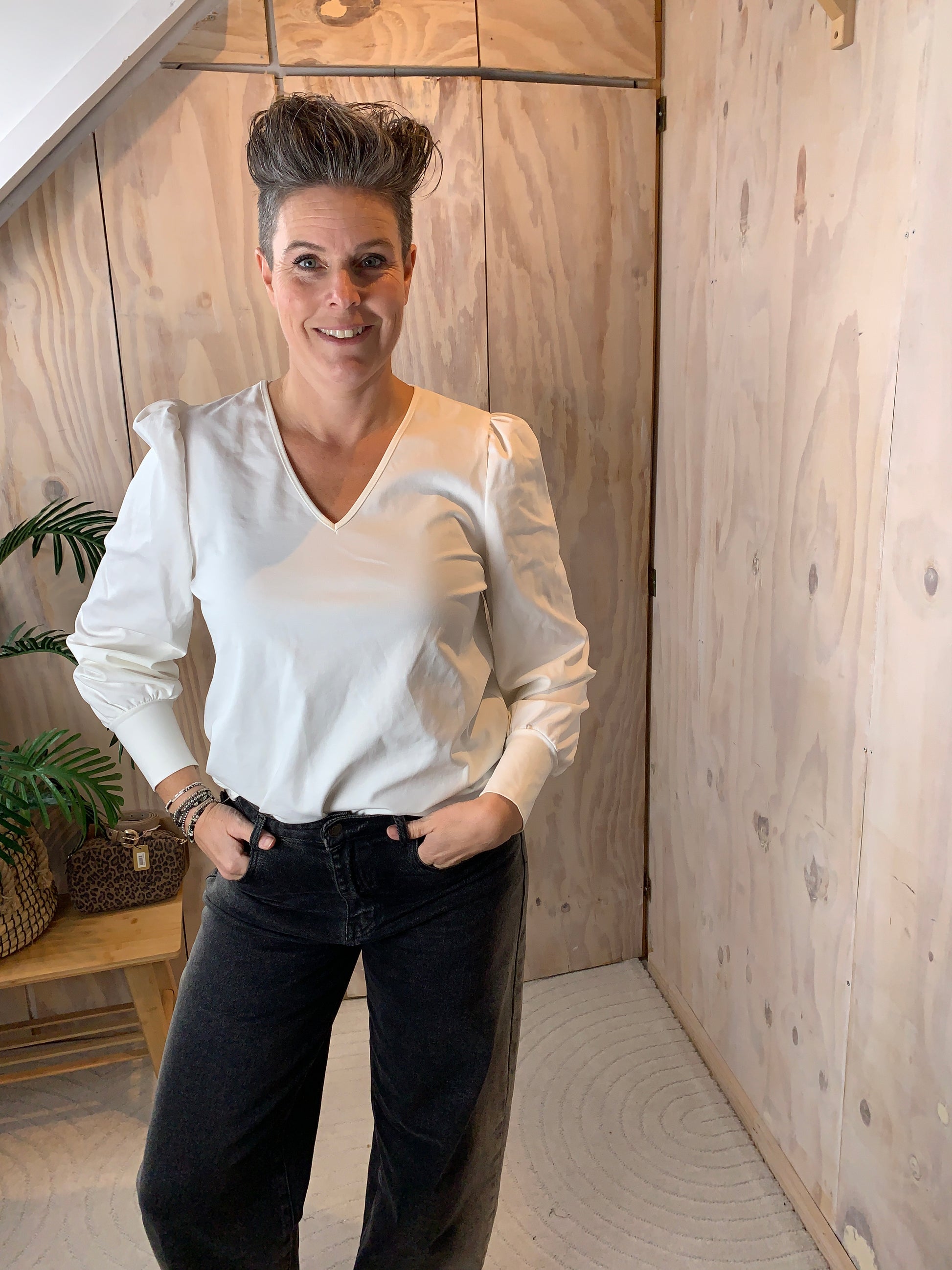 Mooie basis top van Azzurro met v hals en een pofmouwtje en brede mangette