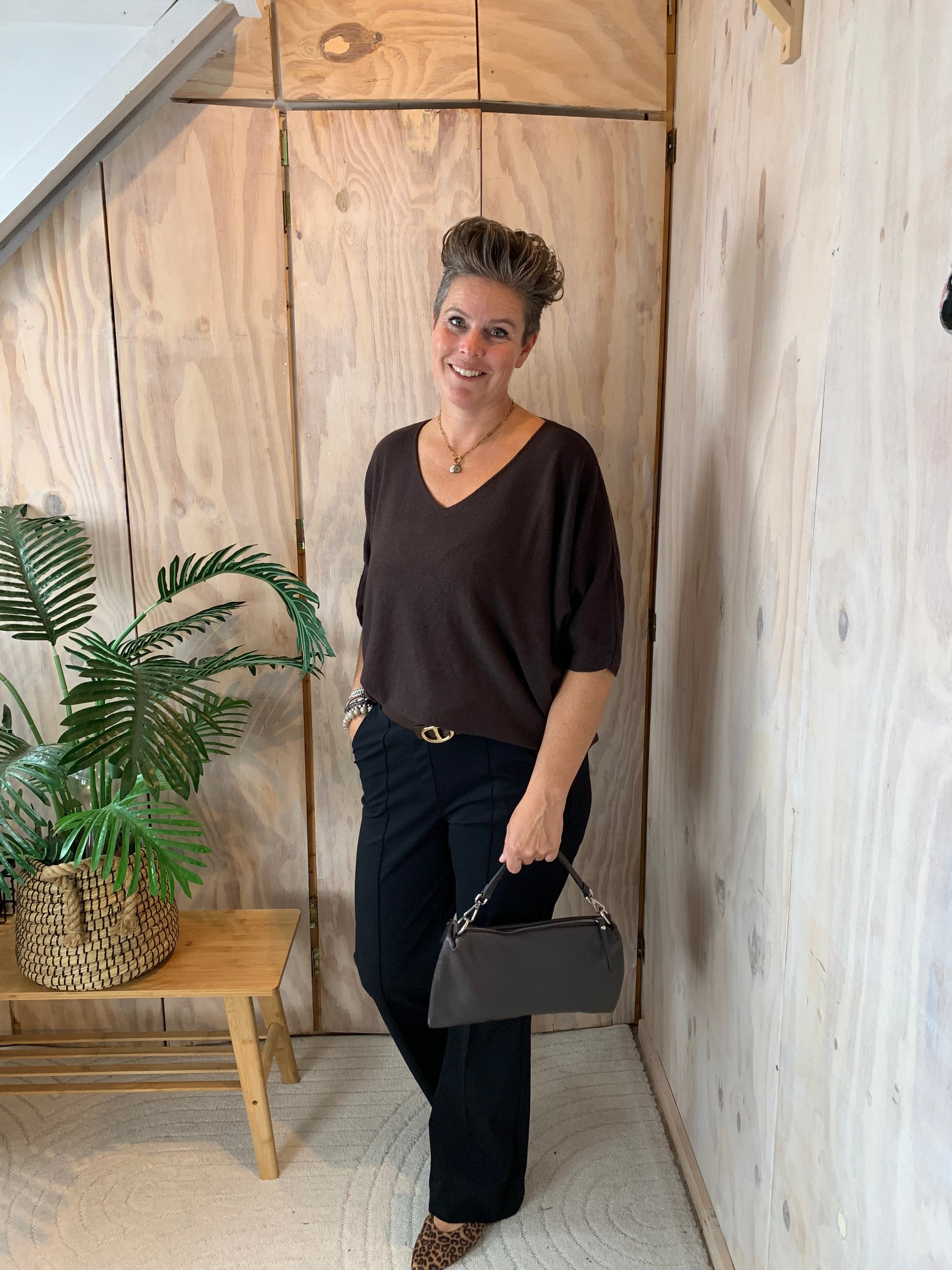 Op zoek naar een trui die je altijd kunt dragen en eindeloos kunt combineren? Dit donkerbruine basis truitje met elegante V-hals is precies wat je nodig hebt. De dikke, hoogwaardige stof zorgt voor een mooie pasvorm en voelt heerlijk comfortabel aan.