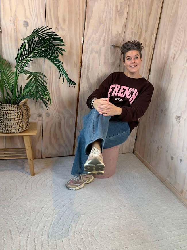 De teddyletters aan de voorkant geven de trui een speelse en trendy touch — bij de grijze variant zijn de letters bordeaux, en bij de donkerbruine variant roze.