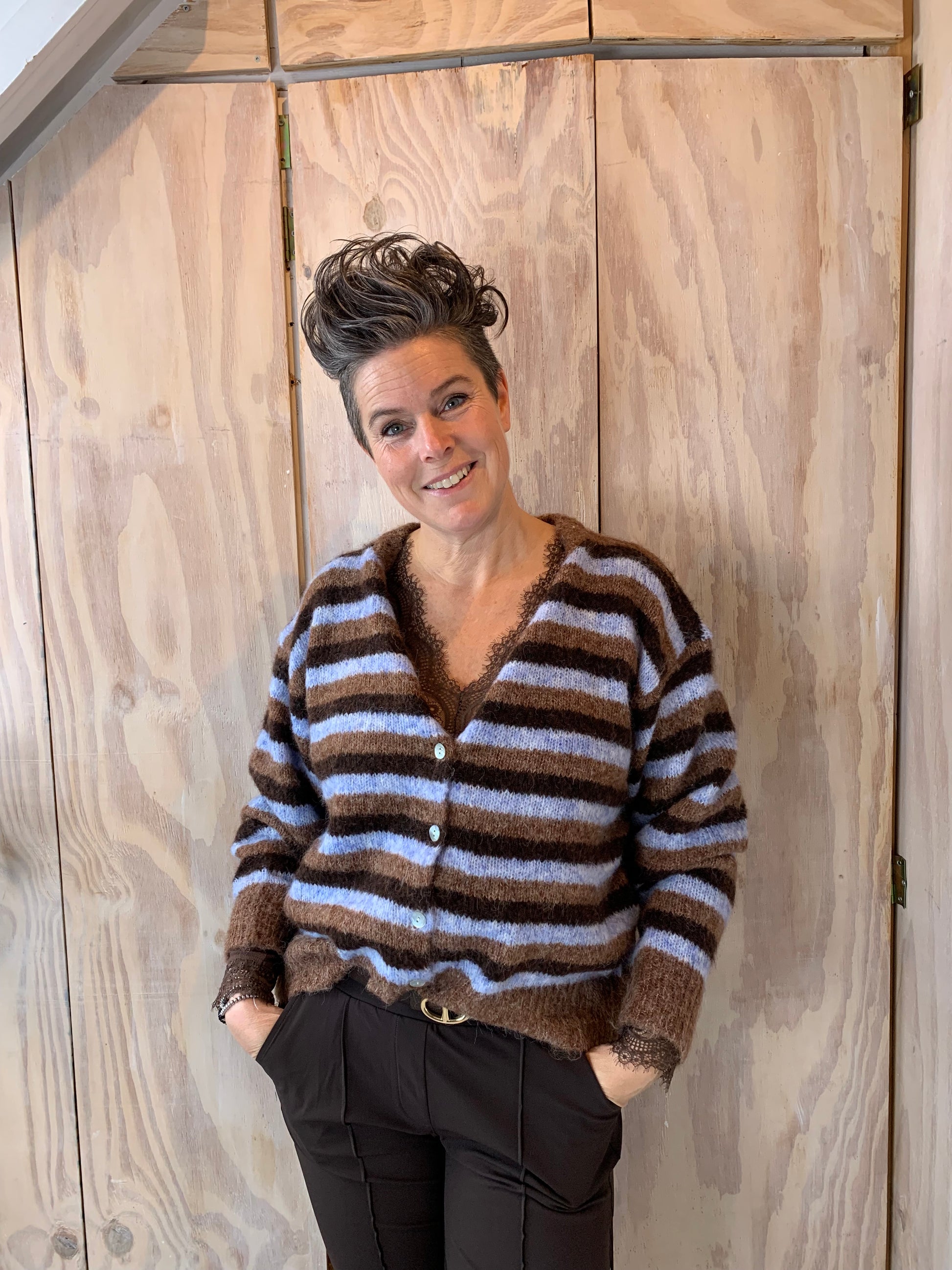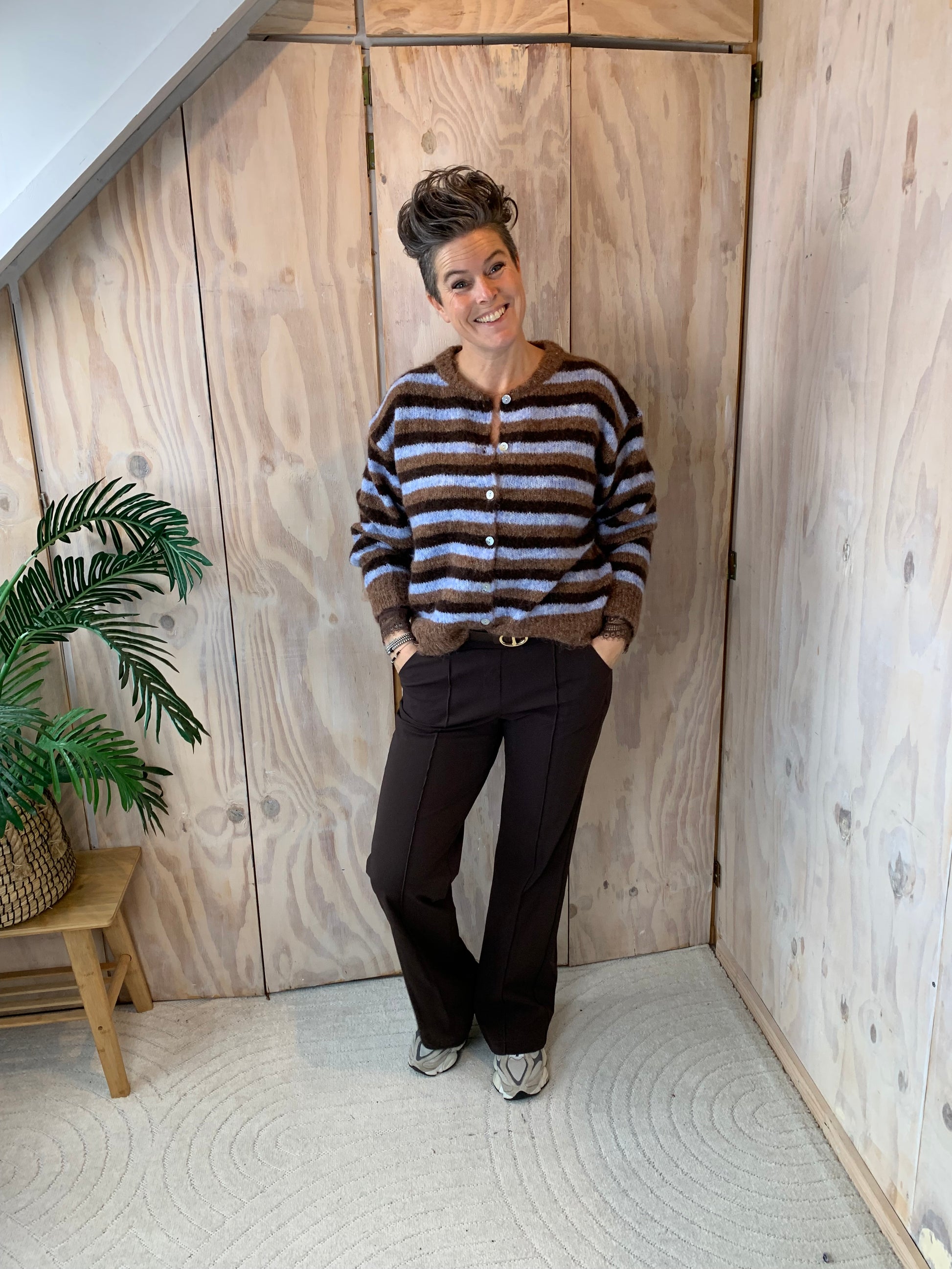 Dit heerlijk zachte, gestreepte vest is zo’n item waar je direct blij van wordt. De combinatie van warme bruintinten met het frisse lichtblauw maakt het een echte eyecatcher, zonder te schreeuwen. De stof voelt fluffy en comfortabel aan, ideaal voor de koelere dagen waarop je nét even wat extra warmte wilt.